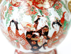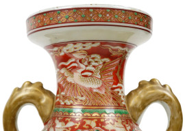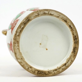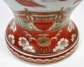 Vaso biansato in porcellana policroma, Cina, XX secolo, corpo a balaustro con decoro raffigurante personaggi orientali, cm h 30
