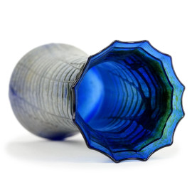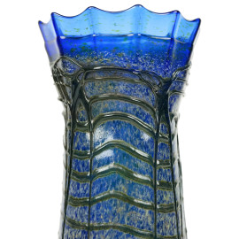 Vaso in vetro blu cobalto, orlo smerlato, inclusioni a foglia d'oro e decori a caldo, cm h 29, XX secolo.