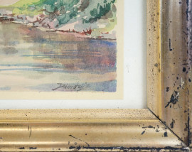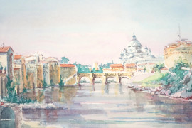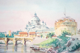 Veduta con Castel Sant'Angelo e S. Pietro, acquarello su carta, cm 20,5x26, firmato, entro cornice.