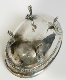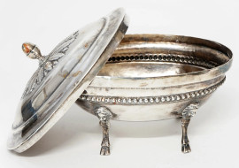 Zuccheriera in argento, XIX secolo, corpo di forma ovale poggiante su quattro piedi caprini, coperchio con presa a forma di ghianda, decori incisi e sbalzati, punzone sotto la base, gr. 225