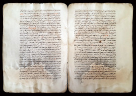 Antica rara doppia pagina manoscritta in caratteri arabi vergati a inchiostro bruno e lacca rossa, Persia, XVI sec.