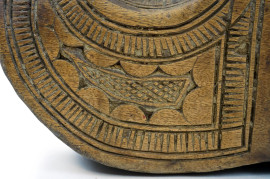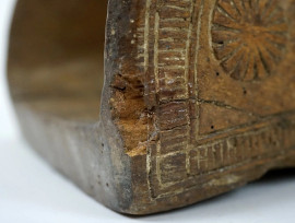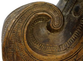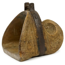 Antica staffa in legno scolpito ed intagliato con particolari in ferro battuto, arte sudamericana, cm 21x21x16, (difetti).