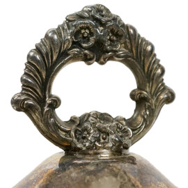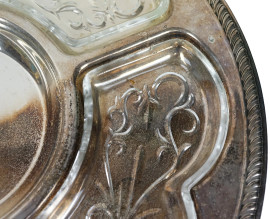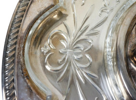 Antipastiera circolare in metallo argentato con vaschette in vetro, cm 7x42, XX secolo, (segni del tempo).
