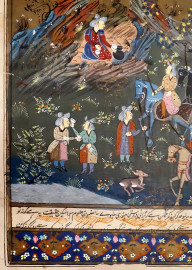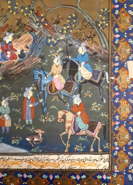 Arte islamica, antica e originale pagina miniata iraniana “Negargarè” raffigurante Pausa conviviale prima della battuta di caccia, Iran primi dell’800, colori vegetali e oro zecchino su carta, cm 32x23, reca iscrizioni vergate a pena d’oca e inchiostro nero in lingua araba