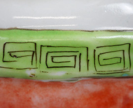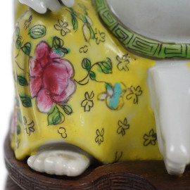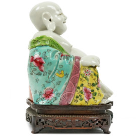 Buddha felice, scultura in porcellana policroma, cm h 18x16x10, base in legno, arte orientale, XX secolo.