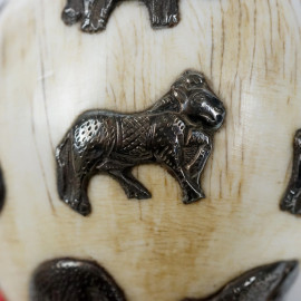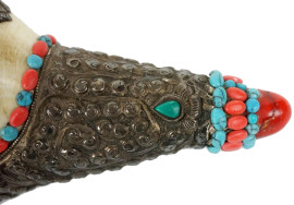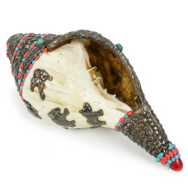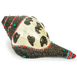 Conchiglia rivestita in lamina d'argento cesellata e sbalzata con applicazioni varie, cm 7x23,5, arte orientale, (difetti)