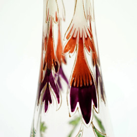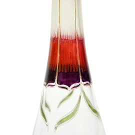 Coppia di bottiglie in vetro con decori policromi, cm h 25, seconda metà XX secolo.