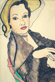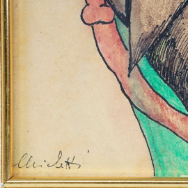 Donna con cappello, tecnica mista su cartone, cm 23,5x17,5, firmato in basso a sinistra, entro passepartout.