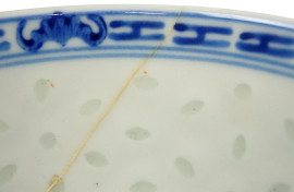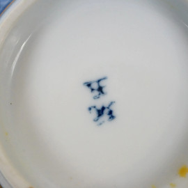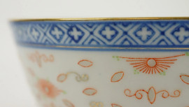 Due coppette in porcellana bianca, blu e rossa con lumeggiature dorate, Cina, XX secolo, cm 5,5x11,5, (difetti)