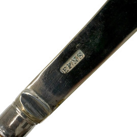 Due set di coltellini con manici in argento e resina, metà XX secolo, entro custodie, lunghezza max cm 19, (segni del tempo).