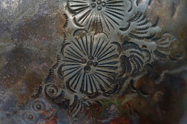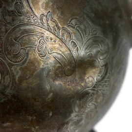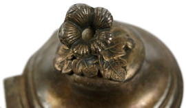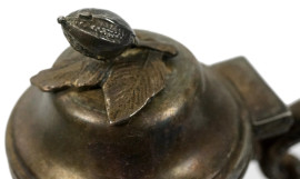 Due teiere in metallo argentato con decori floreali incisi, manici a voluta e prese superiori a guisa di fiore e frutto, cm h 27, XX secolo, (segni del tempo).