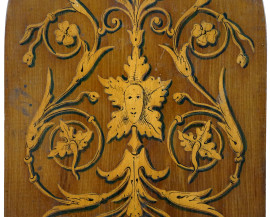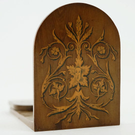 Fermalibri richiudibile in legno con decori a grottesche, cm 14x33, XX secolo.