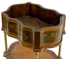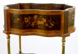 Fioriera in legno impiallacciato, XX secolo, riccamente intarsiata a motivi floreali, struttura a tre ripiani su sostegni in metallo dorato, cm h 93x46,5x31, (difetti).