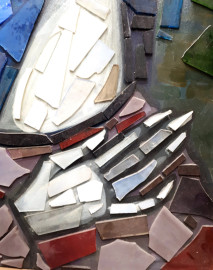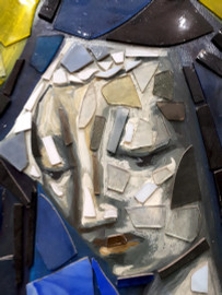 Madonna, tecnica mista e mosaico di vetri colorati su tavola, cm 50x75, firmato, entro cornice.