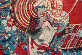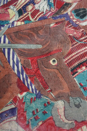 Guerriero combattente a cavallo, stampa a colori, 32x23,5, arte orientale, entro cornice.