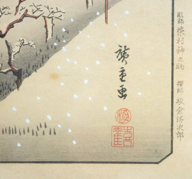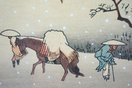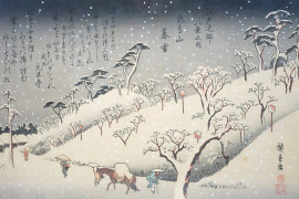 Nevicata serale sul monte Asuka, multiplo a colori recante iscrizioni, cm 25x38, Giappone.