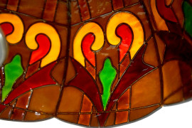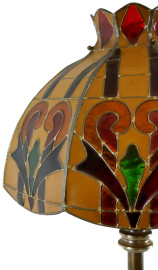 Lampada da terra liberty, struttura in metallo e cappello in vetro multicolore in pasta di vetro, cm h 166, (difetti).