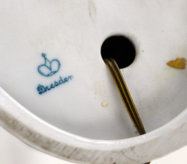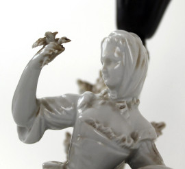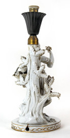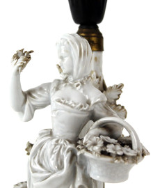 Lampada in porcellana bianca raffigurante giovane con cestino di fiori, Dresda, XX secolo, cm h 28,5x15x12