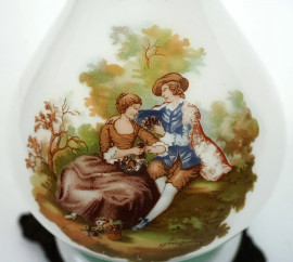 Lampada in vetro opalino bianco e verde, corpo con decoro centrale di scena galante, cm h 57, inizi XX secolo, (segni del tempo).