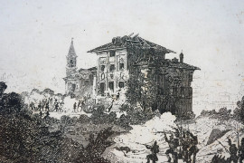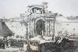Le rovine di Porta S. Pancrazio e Villa Spada, due acquaforti, cm 13,5x17, XIX secolo, entro cornici, (macchie sulla carta)