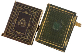 Lotto composto da due album, varie fotografie d'epoca e fogli manoscritti, ingombro max cm 5x22,5x30, XIX-XX secolo, (difetti, un album contenente meccanismo a carillon)