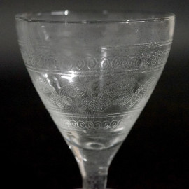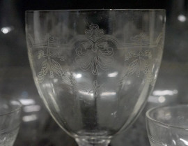 Lotto composto da due bottiglie, un calice e quattro bicchierini da liquore in vetro con decoro di festoni, alt.max cm 22, XX secolo, (sbeccature).