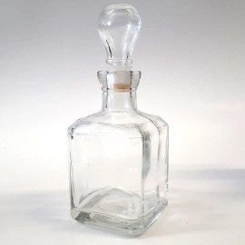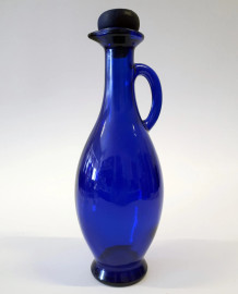 Lotto composto da tre bottiglie, una in vetro blu design stile Monica Bratt Wijkander, e due in cristallo trasparente, varie dimensioni e fogge, altezza massima cm 26