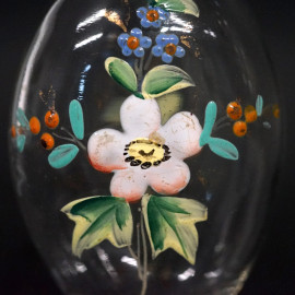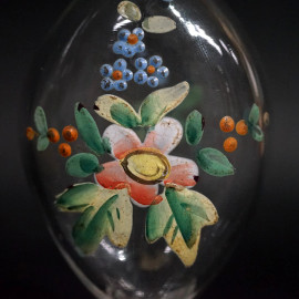 Lotto composto da una bottiglia e due ampolle porta profumo in vetro con decori floreali policromi dipinti a mano, cm h 15,5, metà XX secolo, (piccole sbeccature, mancanti due tappi).