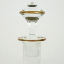 Lotto di due bottiglie ed una caraffa in vetro trasparente con finiture dorate, XX secolo, alt. max cm 32