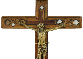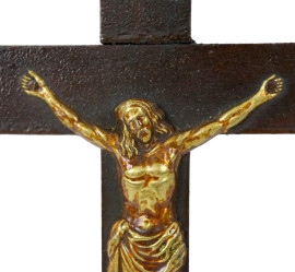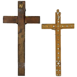 Lotto di due crocifissi in metallo dorato con croci in legno intagliato ed intarsiato, misure max cm 25x12, XX secolo, (difetti, alcuni intarsi mancanti).