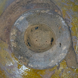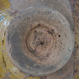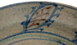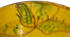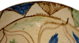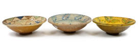 Lotto di tre coppe in maiolica smaltata con decori policromi a smalto, manifatture di epoche diverse, misure max cm 9x31,5, (difetti).