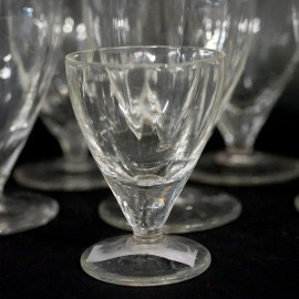 Lotto di undici bicchieri in vetro, composto da quattro bicchieri da acqua, sei bicchieri da vino ed un bicchierino da liquore, alt.max cm 10,5, XX secolo, (sbeccature).