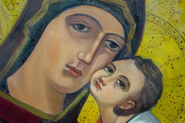 Madonna dell'Elemosina, tempera su tela, cm 76x61, XX secolo, entro cornice, (difetti)