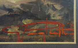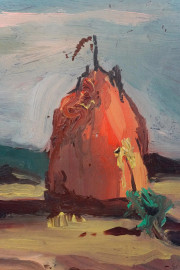 Paesaggio con covone, olio su tavoletta, cm 21x26, firmato, entro cornice