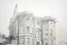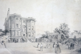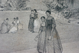 Palazzina nobiliare con coffee house e figure a passeggio, cm 26x38,5, XX secolo, entro cornice, (lievi difetti).