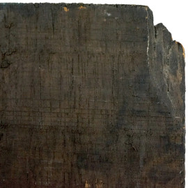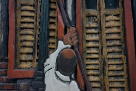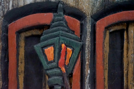 Pannello in legno intagliato e dipinto raffigurante focolaio, cm 87x26, XX secolo. (difetti).