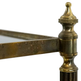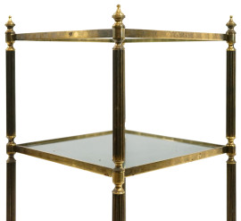 Piccolo tavolinetto da salotto, metà XX secolo, struttura in metallo dorato e tre ripiani in vetro verde, cm h 76,5x33x33, (segni del tempo).