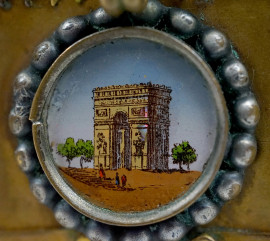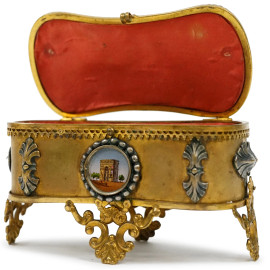 Portagioie in metallo dorato, inizi XX secolo, con decori cesellati e tondi raffiguranti monumenti celebri, cm h 6,5x11x5,5, (difetti).