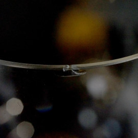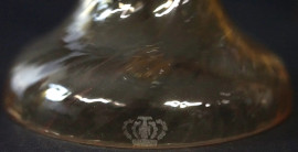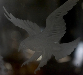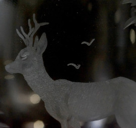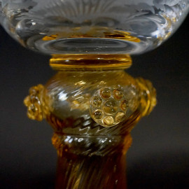 Sei calici in vetro di Murano, XX secolo, coppe con decori molati raffiguranti cervi e volatili, fusto torchon color oro, cm h 21,5, (difetti)