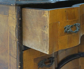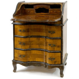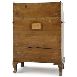 Ribaltina vecchia Verona in legno impiallacciato, fronte ad uno sportello a calatoia e tre cassetti, gambe mosse, cm h 85,5x60x39, (difetti).