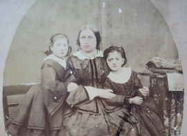 Ritratto di signora con le figlie, fotografia d'epoca ad assetto ovale, cm 19x14, entro cornice, (difetti).