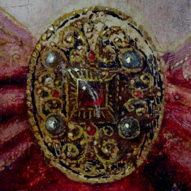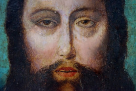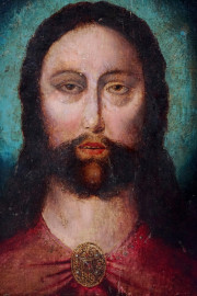 Salvador Mundi, olio su tela applicata su tavola, cm 27x21, inizi XX secolo entro cornice, (difetti).