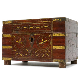 Scatola porta profumi in legno intarsiato, fine XIX secolo-inizi XX secolo, con tre ampolline all'interno, cm 10x15x10,5, (difetti, mancanze)