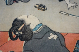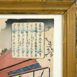 Scena di combattimento, stampa a colori recante timbro ed iscrizioni, cm 36,5x24, Giappone, XX secolo, entro cornice.