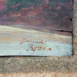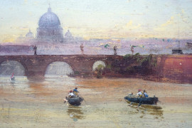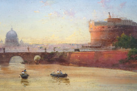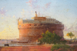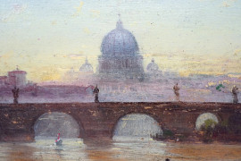 Veduta di Roma con S. Pietro e Castel Sant'Angelo, olio su tavola, cm 12,5x34, entro cornice.