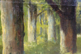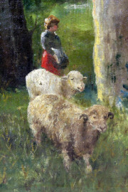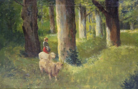 Scorcio boschivo con pastorella, olio su tela, cm 50x75,5, XX secolo, entro cornice, (piccole cadute di colore).