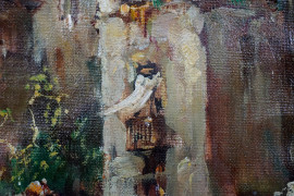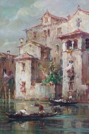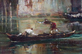 Scorcio con gondolieri, olio su tela, cm 31x25,5, firmato, entro cornice.