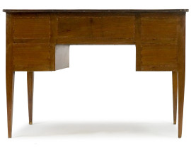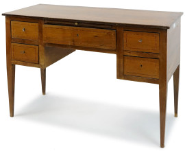 Scrittoio da centro, XX secolo, in legno impiallacciato e filettato, a cinque cassetti con pianetto estraibile, gambe ad obelisco rovesciato, cm 80x116x52, (difetti)