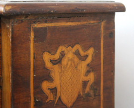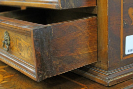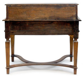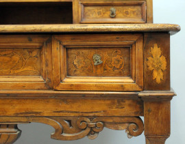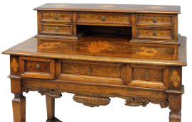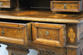 Scrittoio in noce e radica, XVIII secolo, piano con alzata a cinque cassetti e vano a giorno, ricco intarsio a motivi di fiori ed animali, fronte a tre cassetti, gambe troncopiramidali riunite da traversa di forma sagomata, cm h 106x107,5x56, (piccoli difetti).