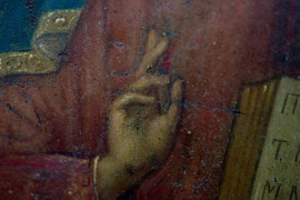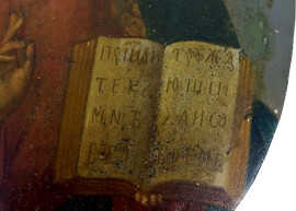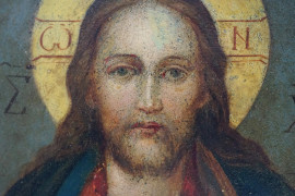 Scuola russa, inizi XX secolo, Cristo benedicente, olio su placca ovale in metallo, cm 16,5x13, (lievi difetti).